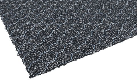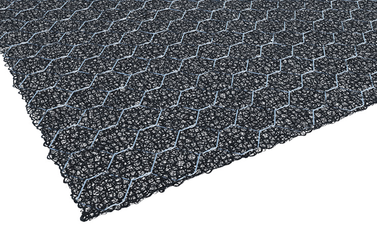 Противоэрозионный геомат, изготовленный из экструдированных полипропиленовых нитей, переплетенных и термоскрепленных между собой, армированный металлической сеткой двойного кручения. Применяется для защиты от камнепада в горной местности и в составе конструкций для предотвращения оползней.