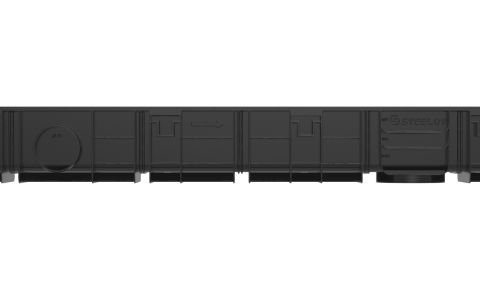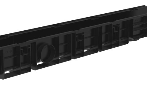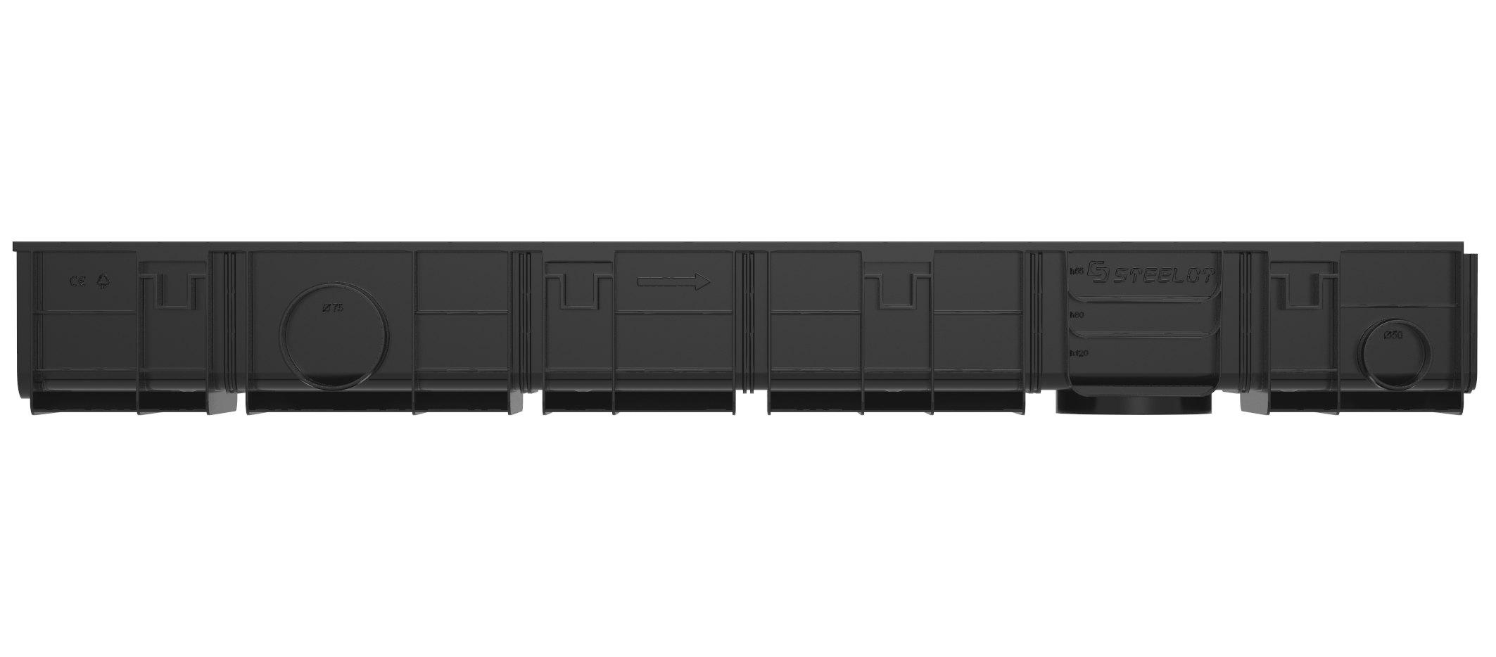 Конструкция лотка с низким бортом 4 мм и высотой 120 мм имеет 5 мест реза для регулировки длины. В ней предусмотрены отверстия для подсоединения отводных труб диаметром 50–110 мм. Модуль может устанавливаться в соединении с дренажными лотками такой же или меньшей высоты.