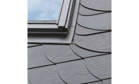 Оклад для установки мансардных окон линии VELUX OPTIMA в профилированные кровельные материалы (натуральная черепица, металлочерепица, профнастил) с высотой профиля до 120 мм. Код оклада ESR. Выполнен из алюминиевого листа, окрашен в темно-серый цвет (RAL 7043).
