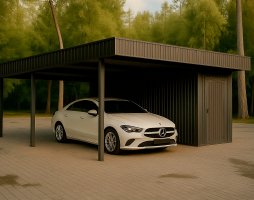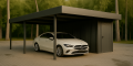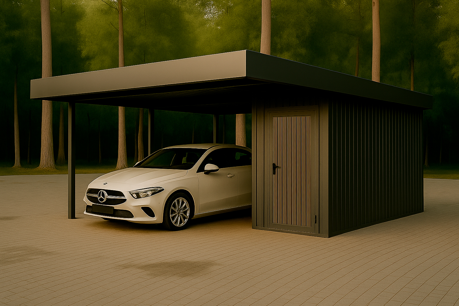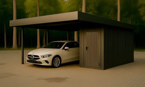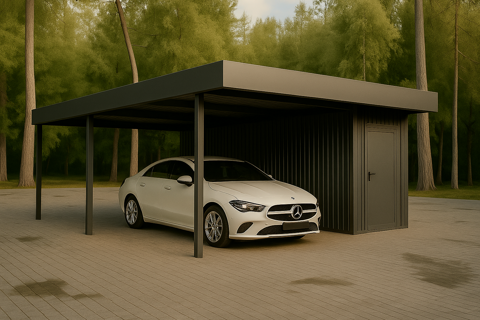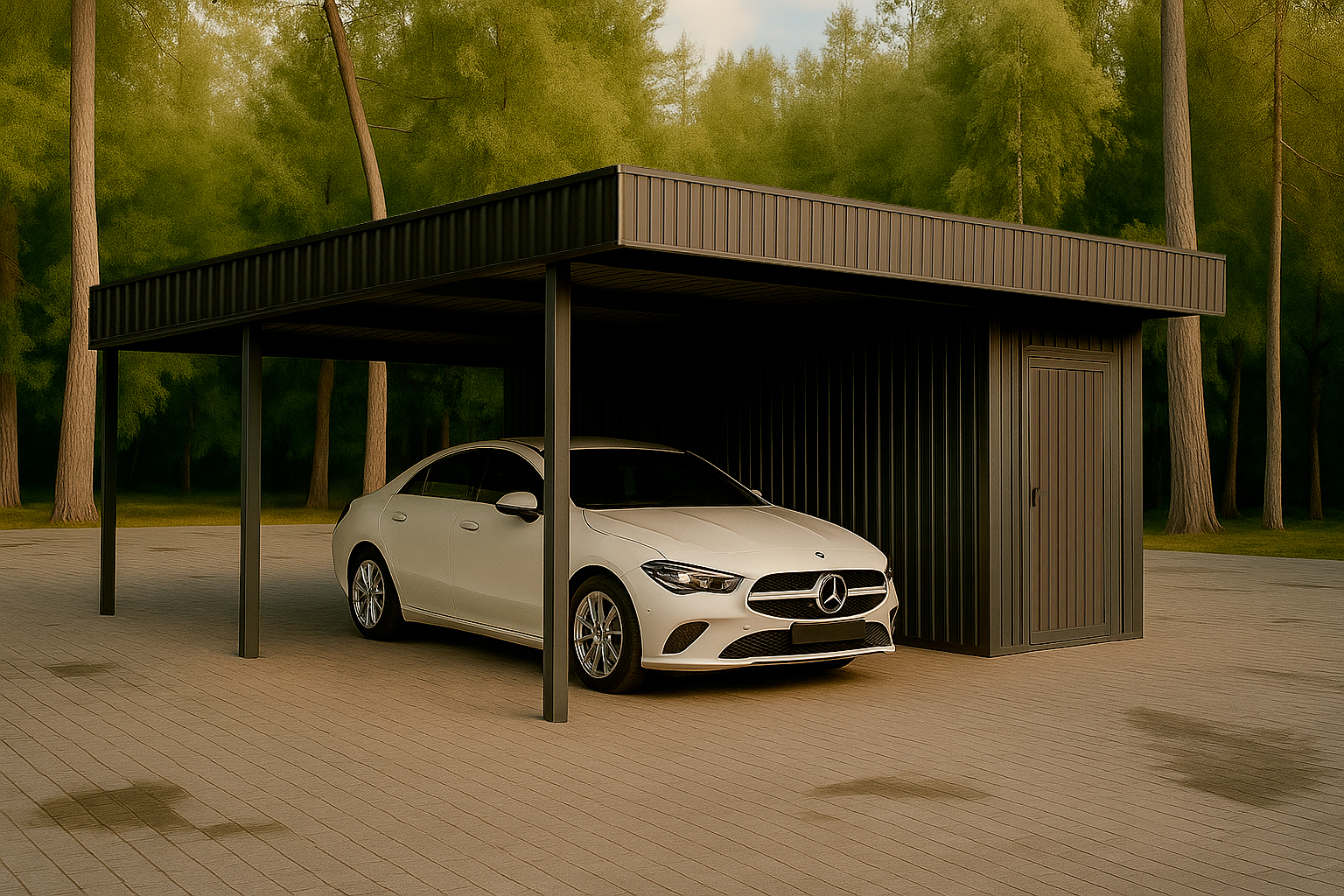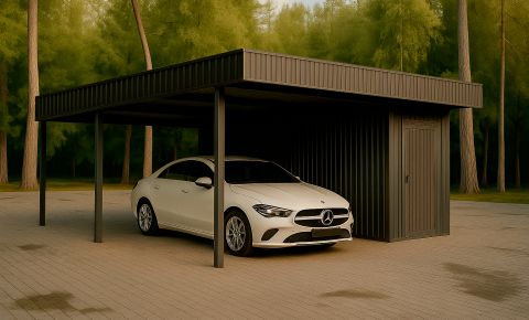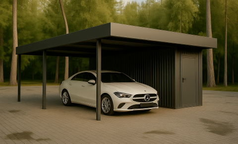 Прочная металлическая конструкция, лаконичный современный дизайн и удобное помещение для хранения инструментов, шин и садового инвентаря.