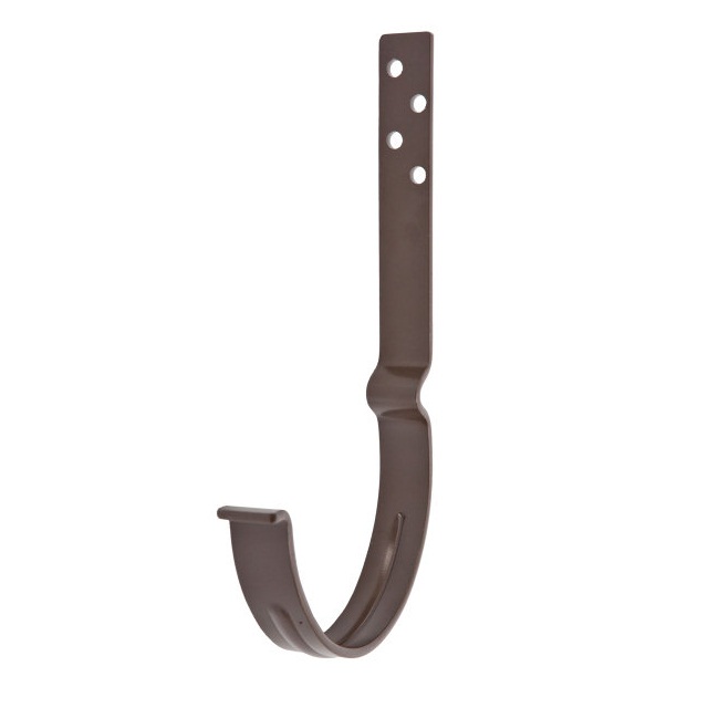Крюк крепления желоба длинный служит для крепления желоба, одновременно обеспечивая дополнительную поддержку геометрических параметров желоба. При помощи крюков обеспечивается необходимый уклон для движения воды в желобе в нужном направлении. Крюки крепления желоба цельнометаллические, изготовлены из стали толщиной 4 мм, что обеспечивает им их прочность. Также крюки имеют дополнительное ребро жесткости, что позволяет им выдерживать большие силовые нагрузки. Используются для установки на верхние плоскости стропил или на сплошное основание кровли. Установка крюков до укладки кровельного покрытия более надежна, чем установка крюков на лобовую доску.