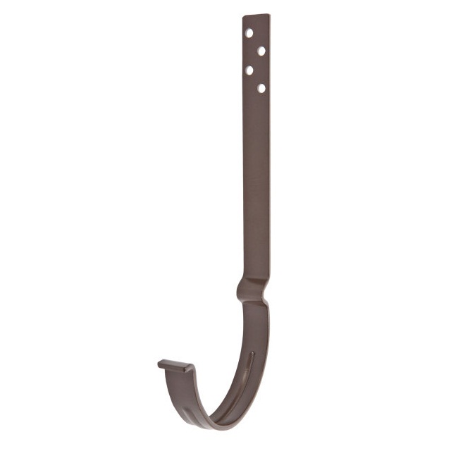 Крюк крепления желоба удлиненный служит для крепления желоба, одновременно обеспечивая дополнительную поддержку геометрических параметров желоба. При помощи крюков обеспечивается необходимый уклон для движения воды в желобе в нужном направлении. Крюки крепления желоба цельнометаллические, изготовлены из стали толщиной 4 мм, что обеспечивает им их прочность. Также крюки имеют дополнительное ребро жесткости, что позволяет им выдерживать большие силовые нагрузки. Устанавливаются по аналогии с длинным крюком, но имеют более длинную рабочую длину, когда длинного крюка, из-за особенностей конструкции кровли, не хватает.