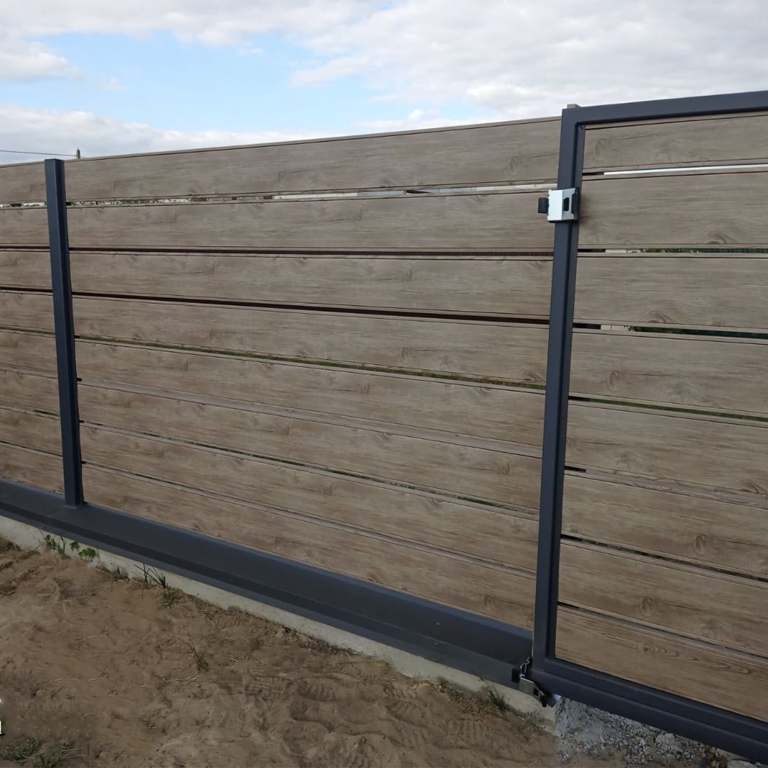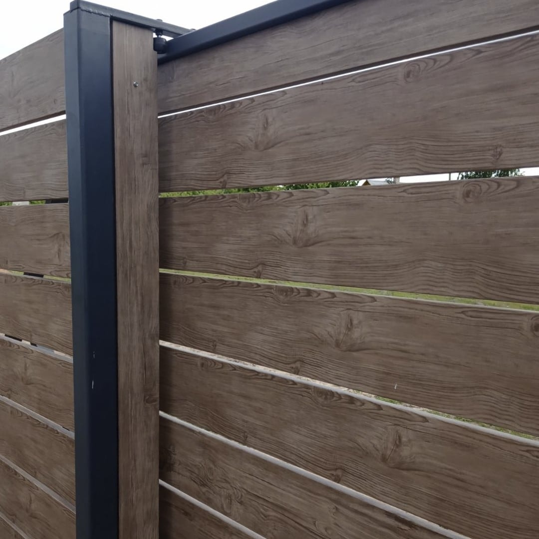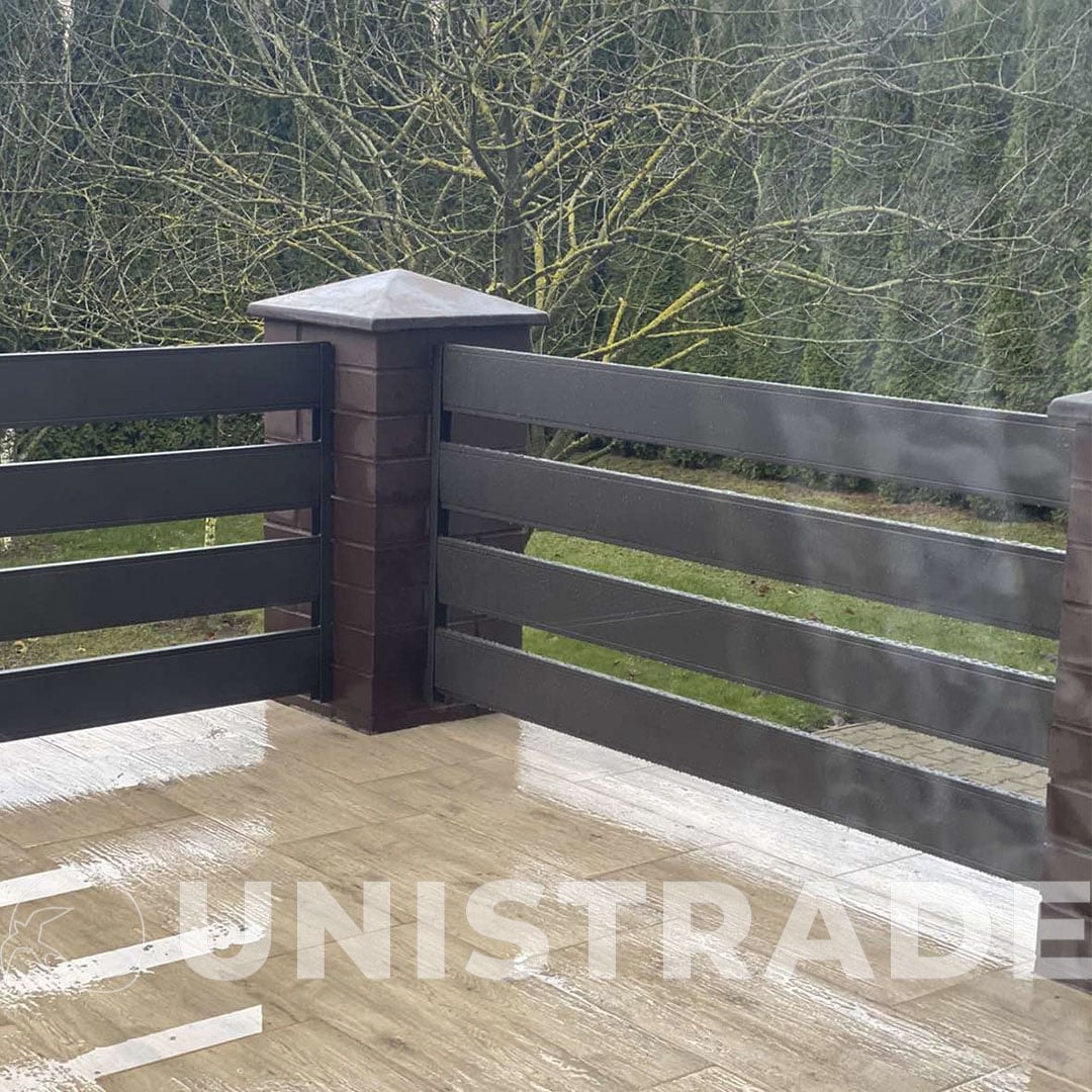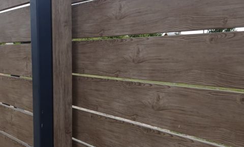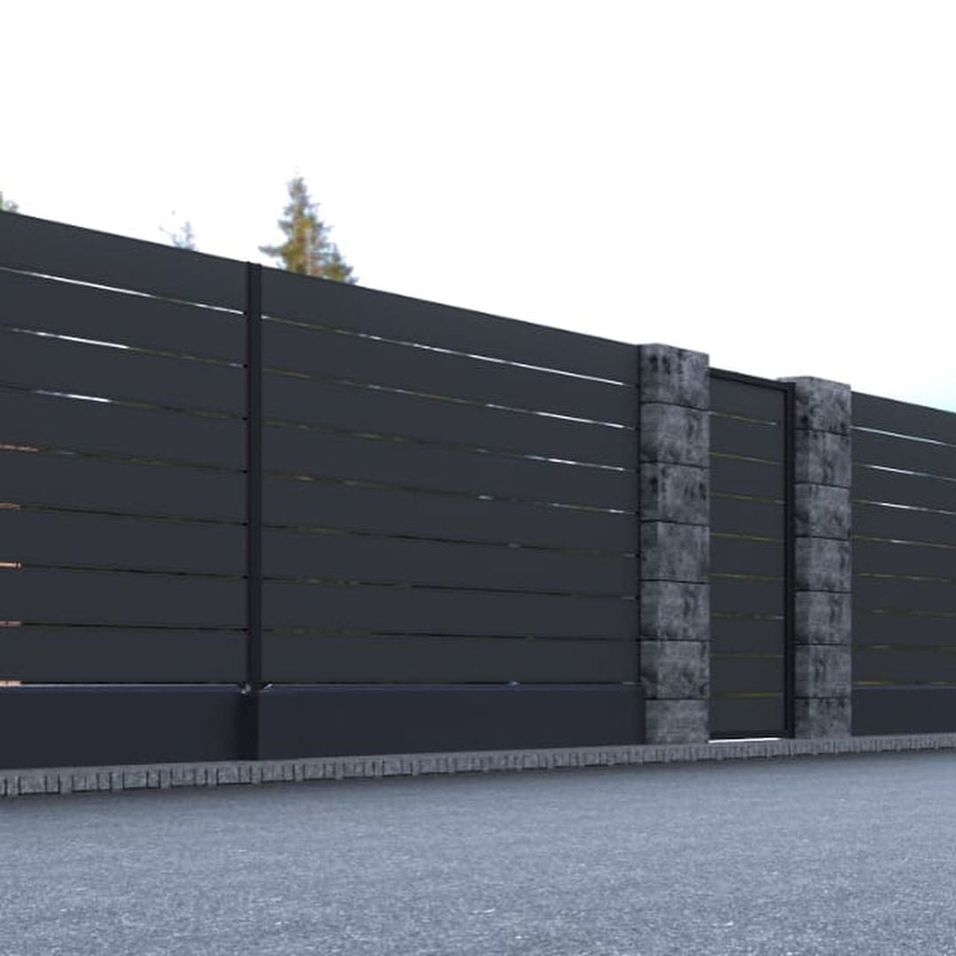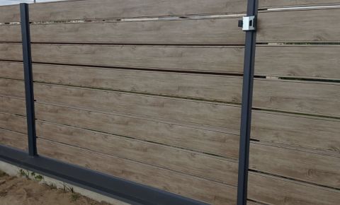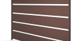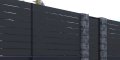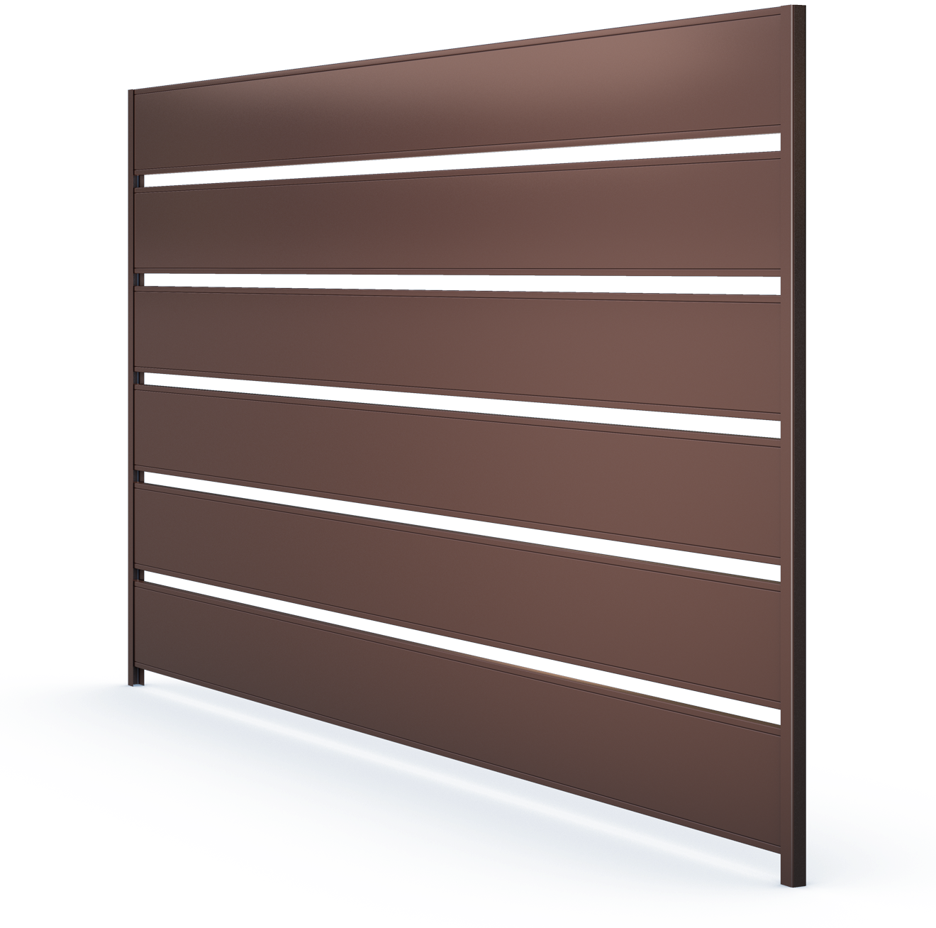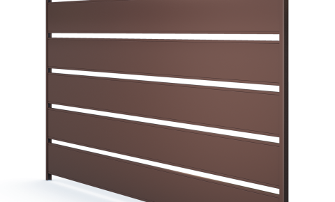 Ширина модуля — 190 мм. Забор собирается из двух элементов, которые соединяются в единую конструкцию. Эта особенность позволяет комбинировать планки с разными цветами покрытия, создавая уникальные визуальные акценты. Расстояние между планками регулируется: минимальный зазор формирует почти глухую поверхность, максимальный — добавляет легкость и воздушность.