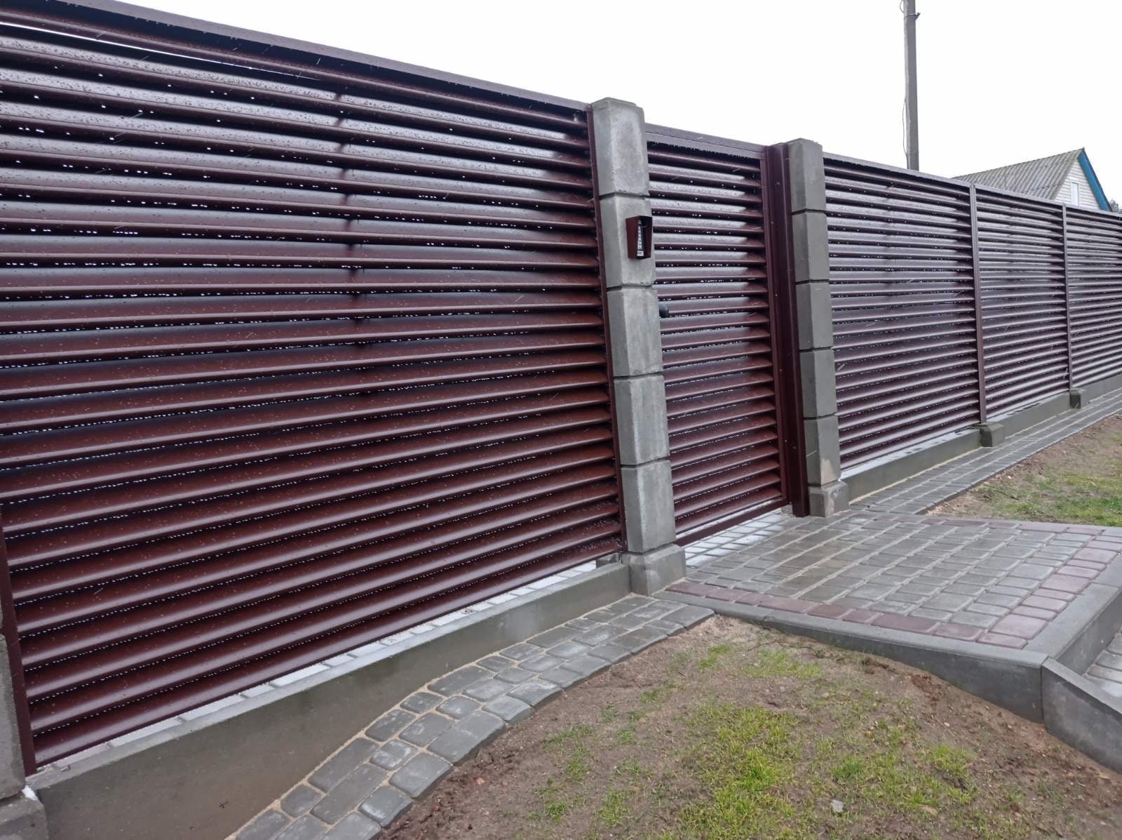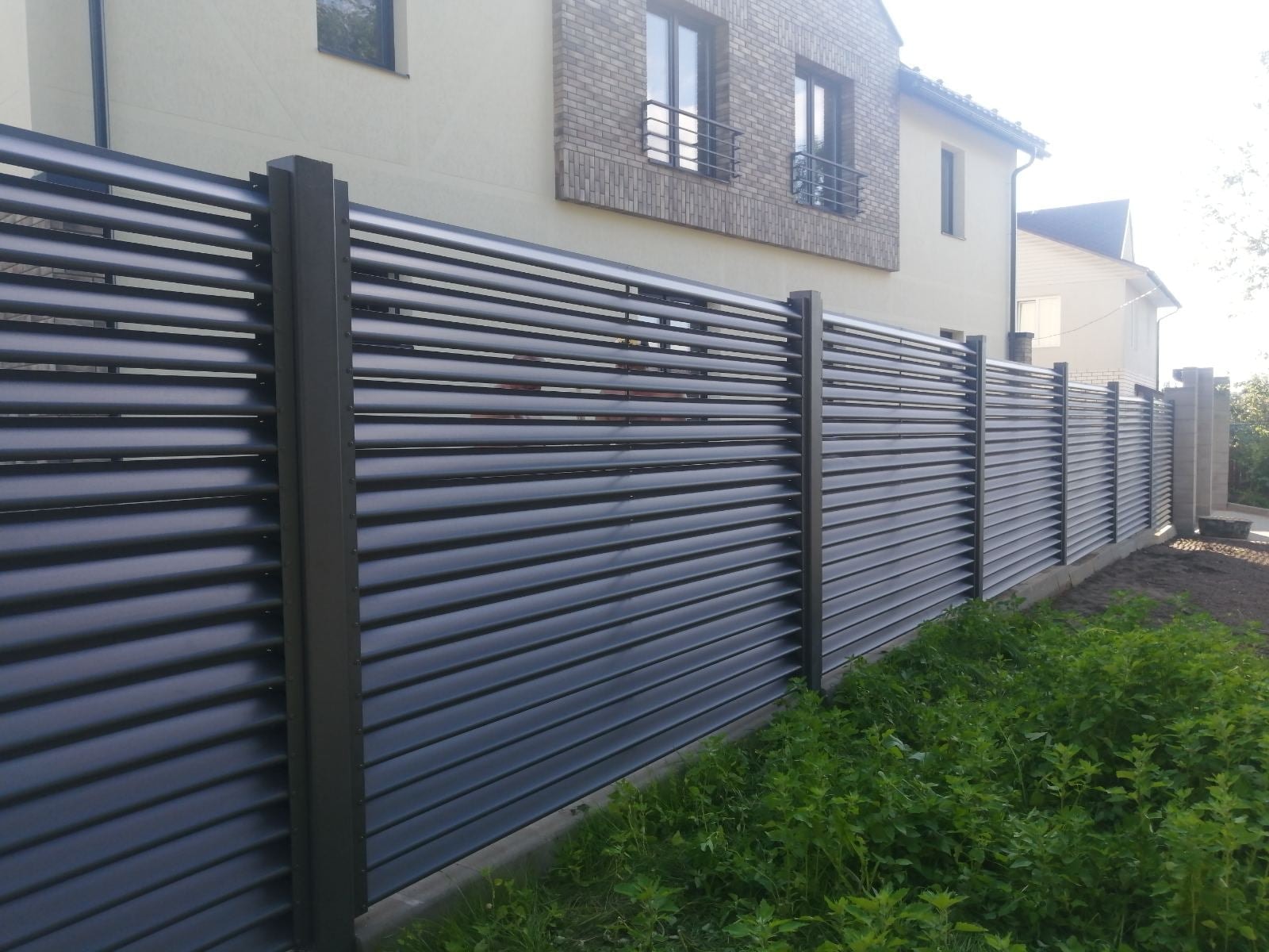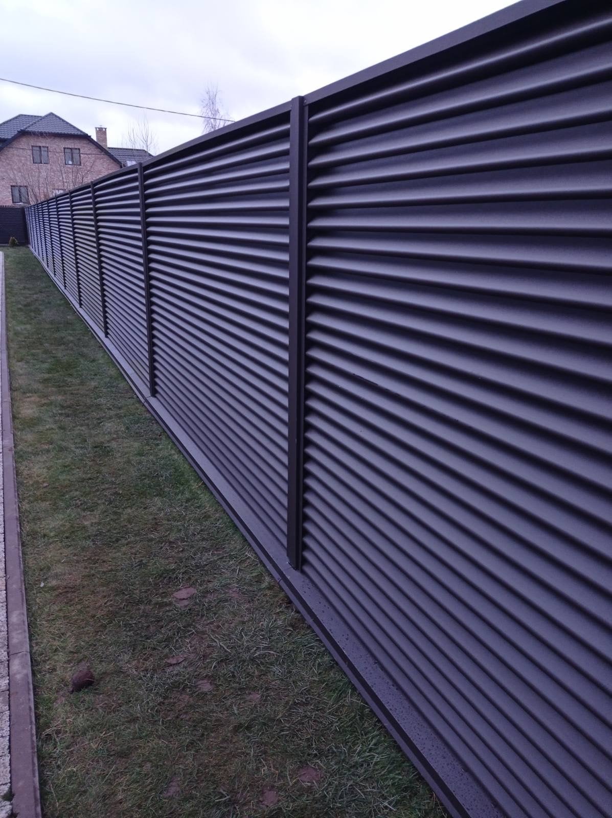Модель «Виола» сохраняет каноны классического забора-жалюзи, но отличается уменьшенными пропорциями, придающими конструкции особую элегантность. Узкий профиль ламели (ширина полки 82 мм) с мягким радиусом изгиба 12 мм визуально облегчает ограждение, делая его идеальным для участков с ландшафтным дизайном в стиле прованс или минимализм.