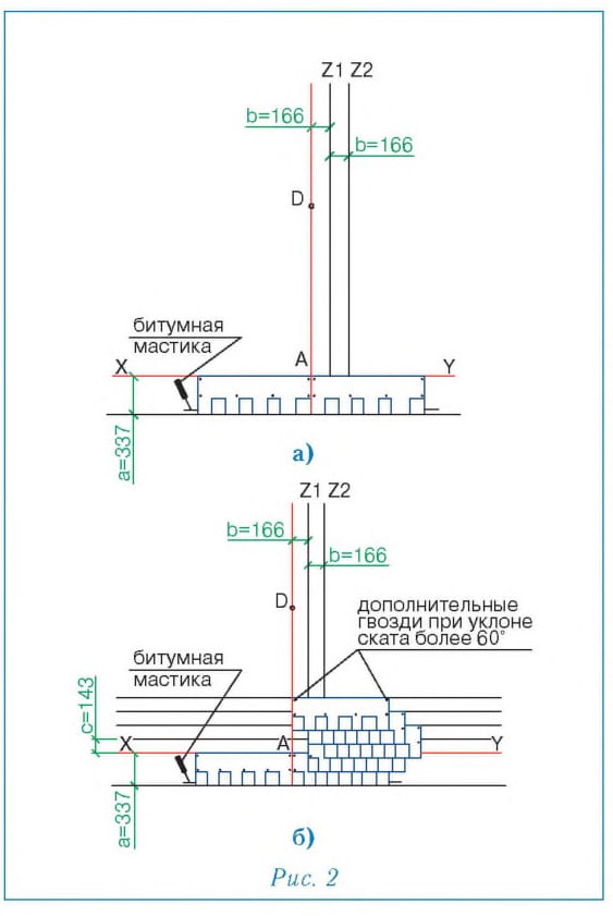 - первый ряд черепицы укладывается от линии АD (рис. 2а)