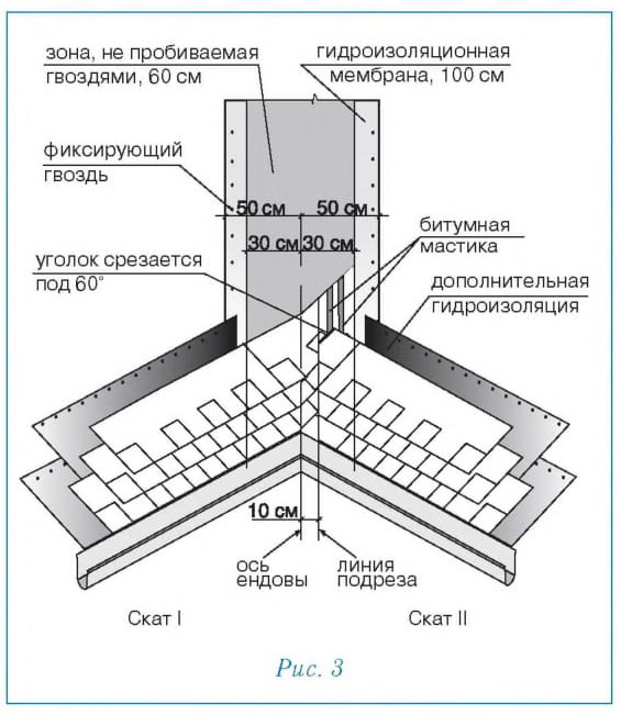 - лист, подходящий к ендове со ската П, должен доходить до линии подрезки и обрезаться по ней. Верхний уголок обрезанного края листа подрезается под углом 600 (5х3 см — рис. З), фиксация листов в ендове осуществляется при помощи битумной мастики, либо наплавлением при помощи теплового строительного фена;