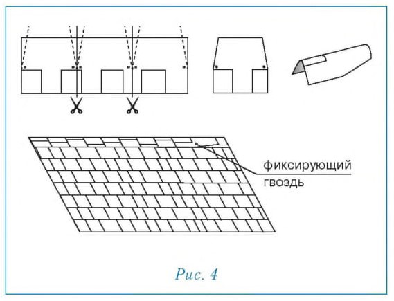 Коньковые элементы нарезаются непосредственно из листов черепицы МАСТЕР и подкраиваются в форме трапеции (рис. 4). Полученные таким образом элементы укладываются внахлест на коньки и ребра (направление укладки по преимущественному направлению ветра). Каждый коньковый элемент фиксируется двумя гвоздями, которые перекрываются следующим коньковым элементом. Для лучшего прилегания и гибкости нижнюю сторону конькового элемента рекомендуется прогреть при помощи теплового строительного фена и обработать по периметру битумной мастикой.