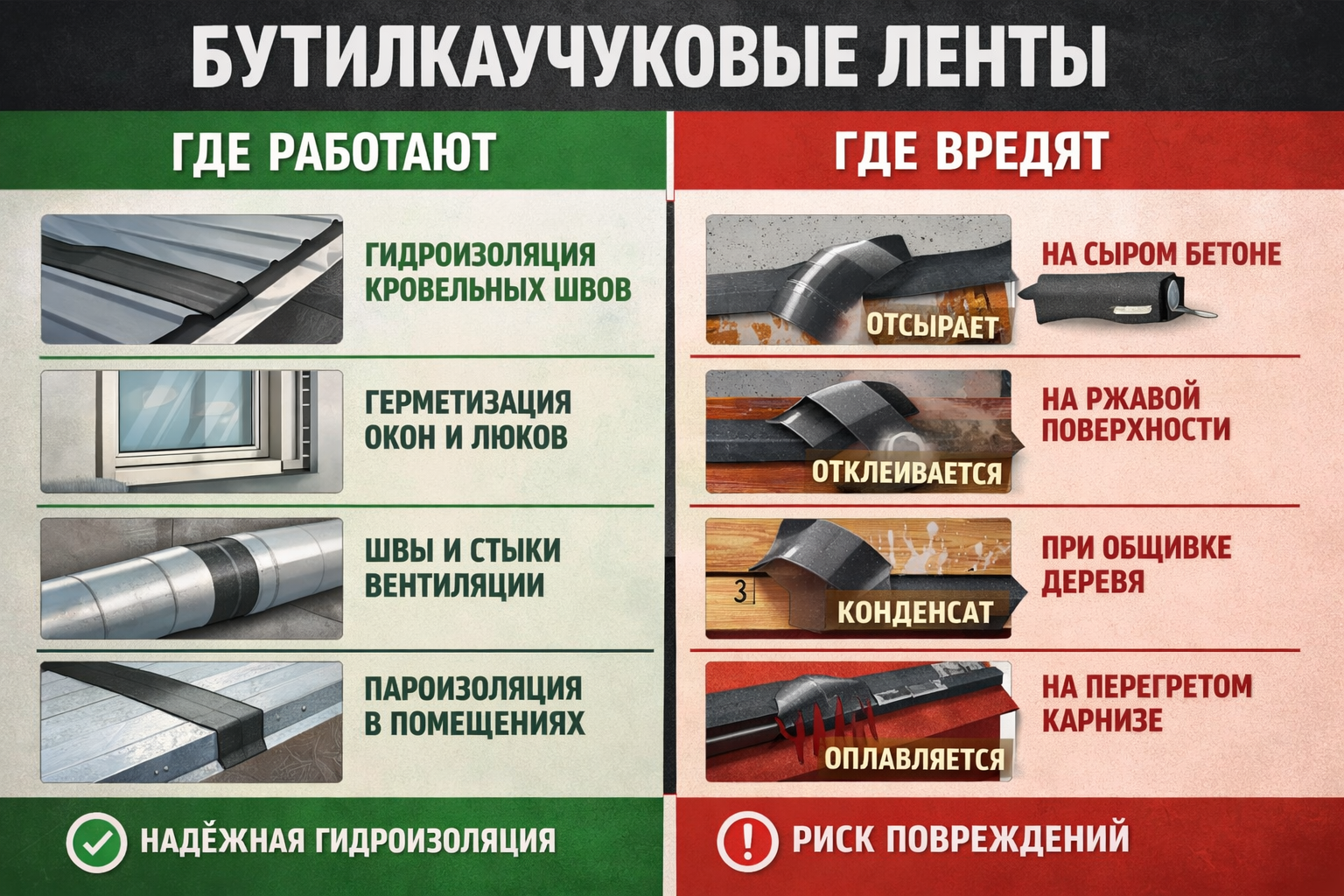 Именно здесь бутилкаучуковая лента начинает вредить конструкции, хотя сама по себе она ни в чём не виновата. Она отлично герметизирует, но если герметизировать ею воздуховпуск или участок, где должен идти конвективный поток, кровля начинает сушиться хуже. Дальше сценарий развивается уже по законам строительной физики: повышается влажность, ухудшается состояние утеплителя, меняется температурный режим ската. Поэтому правило очень простое: лента не должна закрывать то, что проектом оставлено для движения воздуха.