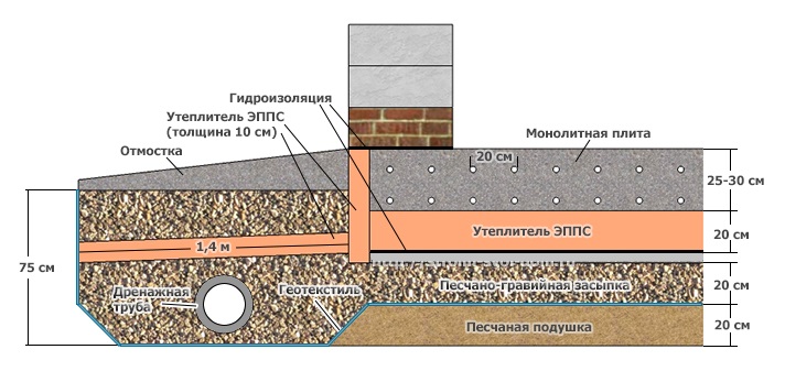 В отличие от ленточного фундамента, который представляет собой тонкостенную конструкцию с замерзающими и вечно отсыревающими пустыми пространствами внутри, плитный фундамент этих пустых пространств не имеет. Он кладется прямо на грунт с песчаной подсыпкой (на глиняной основе) в качестве отводящего за пределы периметра влагу слоя, можно ещё уложить на песчаную подушку слой теплоизоляционного материала (например, пенополистирола), если плита получится слишком тонкой. Но, в принципе, бетонная плита сама по себе и подушка, и изолятор, особенно учитывая тот факт, что под ней грунт никогда не замерзает, то есть постоянно, даже в самые сильные морозы, он имеет температуру выше нуля – земля-то вообще-то сама по себе тёплая, а холодной ее делает зимний мороз. Так вот, мороз под плиту не проникает, поэтому проявляется еще одно замечательное свойство плитного фундамента – под ним не возникает такого явления, как морозное пучение грунта.