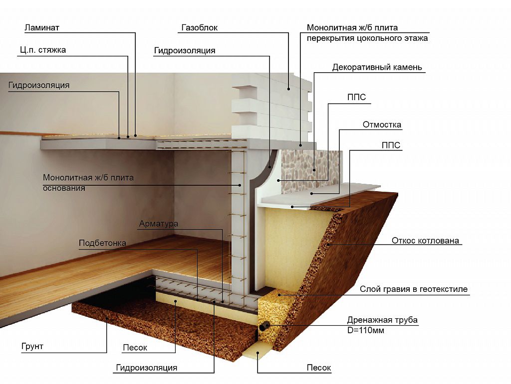 Ленточный фундамент – холодный. Основание, на которое укладывается пол первого этажа, необходимо хорошо утеплять и гидроизолировать, потому что влага из вечно затапливаемых полостей фундамента постоянно пробивается наверх, в результате нижние части стен и полы постоянно сырые, в доме разводится плесень и грибок. Даже если все работы произведут опытные мастера, это не гарантия того, что через время ленточный фундамент не «потечет». Влага, которая собирается под фундаментом, в морозы замерзает, и как ни утепляй пол, его все равно придется подогревать, например, с помощью системы «теплый пол», которую, впрочем, не всегда можно смонтировать. В общем, сухой подвал под домом не построить, но без него будет все еще хуже.