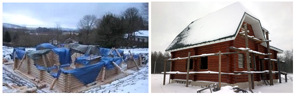 Однако, несмотря на довольно быстрое возведение данного типа строений, по различным причинам может возникнуть такая ситуация, что строительство не может быть завершено до наступления зимы. В этом случае не стоит паниковать. Ничего страшного не произойдет, если грамотно законсервировать постройку на зиму. Даже более того, деревянные дома советуют оставлять в первую зиму без отопления для того, чтобы произошли естественные процессы сушки и усадки дерева. В противном случае, если брус сырой, но при этом снаружи на него будут действовать минусовые температуры, а изнутри будет греть отопление, его просто на просто скрутит, что приведет к нарушению конструкции всего дома, смещению оконных и дверных проемов. В связи с этим окна и двери в первую зиму лучше не устанавливать.