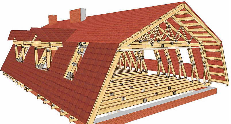 Такая крыша – тоже двухскатная, но более сложная. Она еще называется мансардной, так как позволяет увеличить объем мансардного помещения, устраиваемого под ней. Достигается это путем разделения двух скатов крыши на две части в продольном направлении, верхняя часть ската имеет меньший наклон, а нижняя часть – больший. Подобная конструкция имеет характерный «ломаный» вид, который обеспечивается устройством очень сложной стропильной системы.