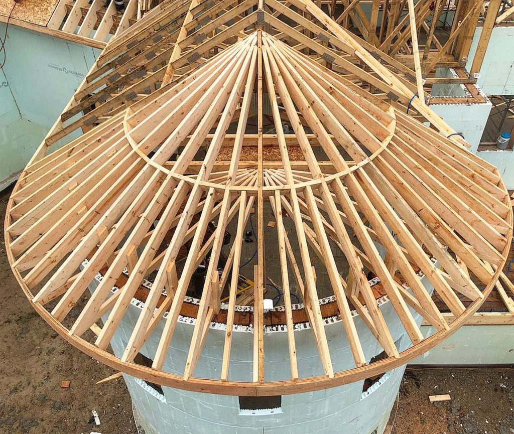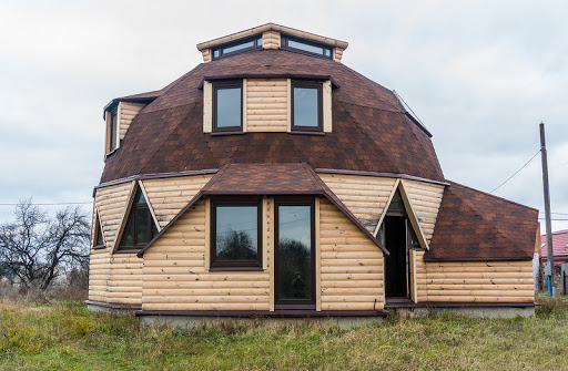 Очень редкий тип крыши в загородном домостроении, хотя в городских условиях ее применяют для многих типов зданий, например, для крытых спортивных площадок, бассейнов, цирков и многих других. Однако если появилась идея построить купольную крышу для своего загородного дома, то надо приготовиться к тому, что очень сложная стропильная система потребует больших расходов.