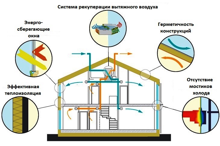 Вентиляция с рекуперацией тепла. Пассивные дома оборудованы системами вентиляции с рекуперацией тепла, которые позволяют использовать тепло отходящего воздуха для предварительного нагрева входящего свежего воздуха.