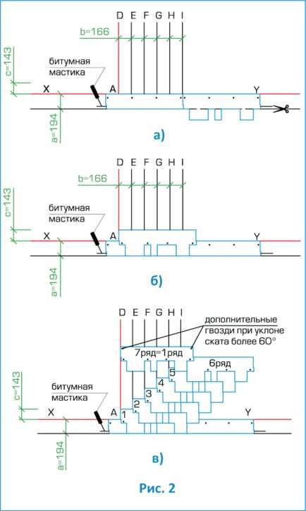 - Начальный ряд формируется из листов черепицы ФУТУРО с обрезанными лепестками. Полученные таким образом полосы шириной 19,4 см укладываются по линии карниза в обе стороны от линии I (рис. 2а) и фиксируются по нижнему краю битумной мастикой, а по верхней кромке 4 гвоздями (ось гвоздей на 5 см ниже верхнего края полосы);