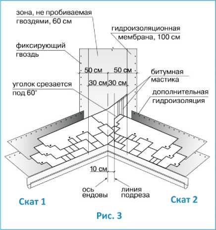 - лист, подходящий к ендове со ската II, должен доходить до линии подрезки и обрезаться по ней. Верхний уголок обрезанного края листа подрезается под углом 60° (5 х 3 см — рис. 3);